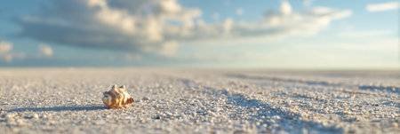 An AI generated illustration of a sandy beach with an empty, white shell resting on its surface