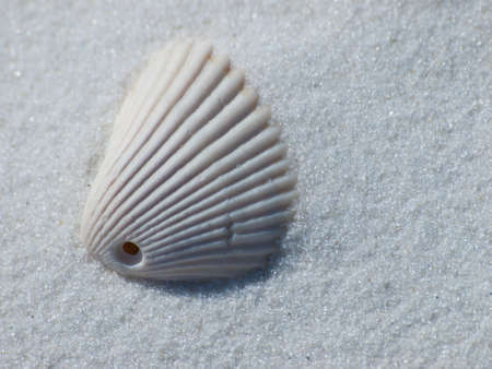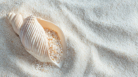 A detailed image displays a large seashell, cream in color, filled with sand. The seashell is situated on a bed of fine, textured white sand, creating a visually appealing contrast. Natural lighting suggests an outdoor setting. The image is suitable for various commercial uses, including website backgrounds and print media.