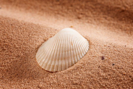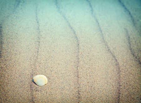 Seashell on the sand, Abstract texture for design, close up, copyspace, summer concept. Selective focus. nature.