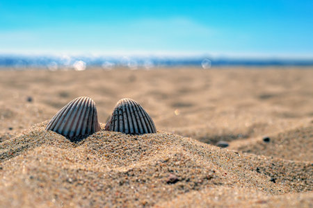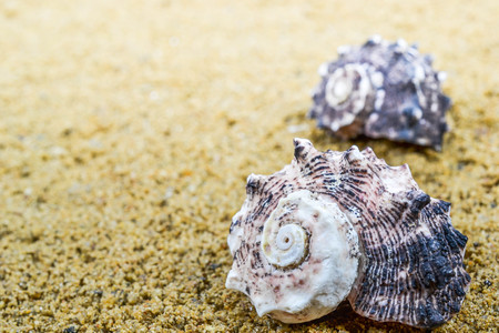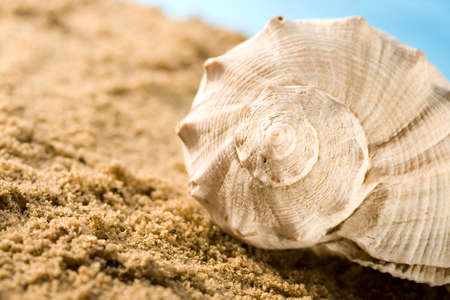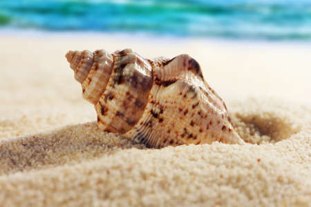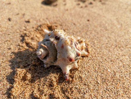 Sea shell on the sand close up as a beach background with copy space. Vacation theme concept
