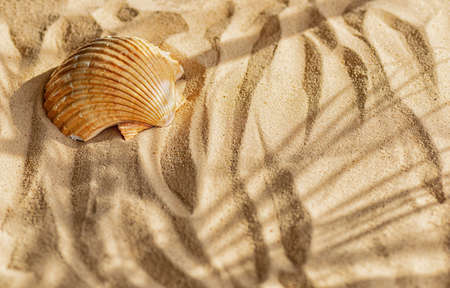Beach sand with seashell, shadow of palm tree. Copy space for text. Seasonal vacation and travelling concept. Close up.