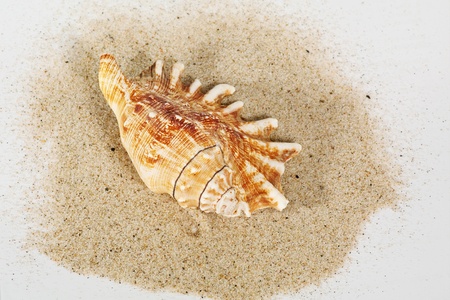 Spotted light spiky exotic seashell on sandy beach with waves on background