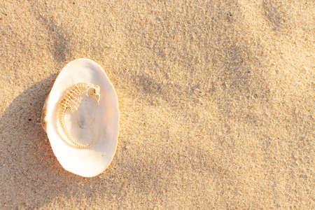 Striped sea horse is on shell conch on sand on beach at sunrise. Natural seashell. Traveling and feeling lonely, cheering up, rest, refresh and relax. Vacation mood concept. Copy space for text.