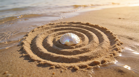 Delicate digital rendering with intricate sand textures and subtle luminous reflections, fostering a mood of deep meditation and serene exploration. Suited for wellness websites, yoga retreat materials, mindfulness posters, spa branding, and therapeutic apps. The harmonious beige palette and precise detailing enhance its appeal for contemporary design projects. . AI-generated illustration.