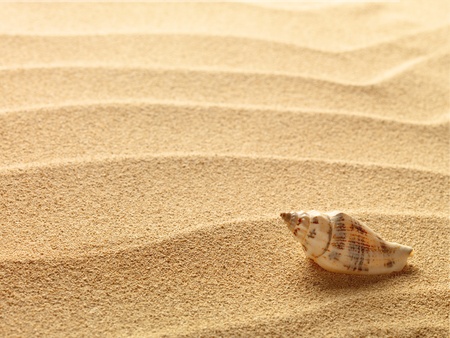 Shell on sandy background. Summer beach concept with copy space. Macro shot