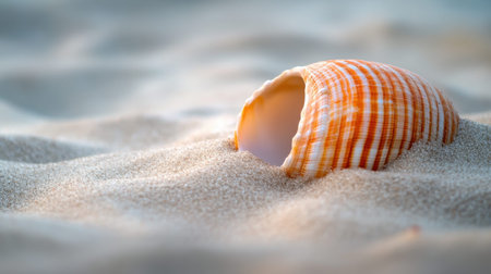 A stunning close-up of a vibrant orange and white shell resting on the soft sand, evoking a sense of peace and natural beauty found along sunlit beaches.