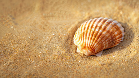 A seashell lies gently nestled in the soft sand of a beach, surrounded by scattered grains of sand and tiny pebbles. The bright sunlight highlights its intricate details and delicate curves.