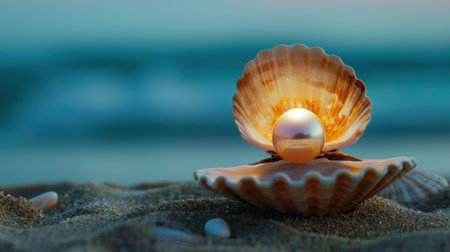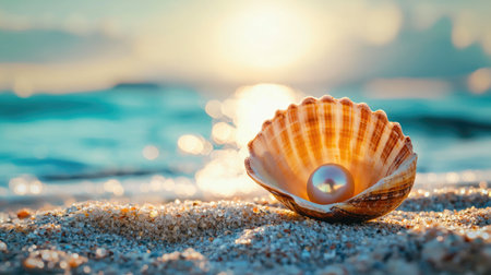 This captivating image features an open seashell with a luminous pearl resting within, set on sandy beach. The soft light illuminates the scene, creating a serene and tranquil atmosphere. The gentle ocean waves in the background enhance the natural beauty of this coastal treasure, making it ideal for themes of nature, calmness, and elegance.