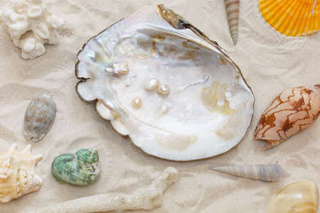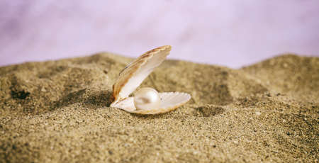Macro photo of a white oyster pearl nestled in an open shell on a sandy seashore, symbolizing beauty, purity, and love.