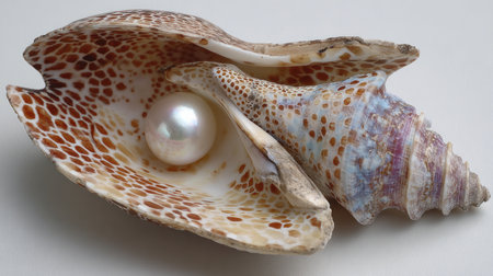 A lustrous white pearl sits nestled within a detailed seashell. The image showcases the shell's unique spotted patterns and natural textures. Soft lighting highlights the pearl's round shape and reflective surface. This image could be suitable for various commercial purposes, including decorative designs and illustrative content.