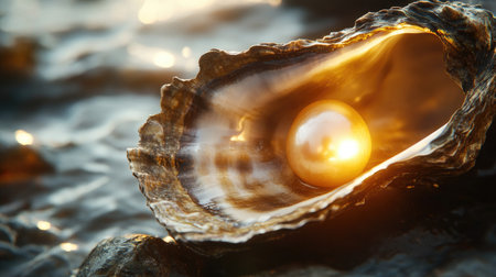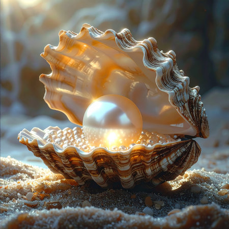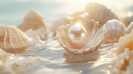 A stunning close-up of a shining pearl nestled in a seashell, surrounded by soft ocean waves and warm sunlight, creating a serene coastal ambiance.