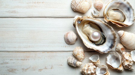 An exquisite arrangement featuring an oyster with a lustrous pearl amidst various seashells on a light wooden background, ideal for nature and beauty themes.