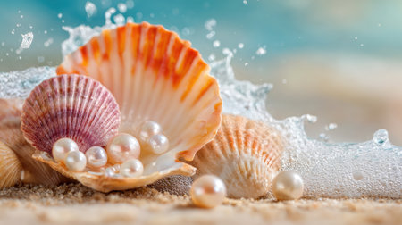 A captivating scene showcasing beautiful shells and lustrous pearls on a sandy beach, with gentle waves creating a serene atmosphere perfect for summer.