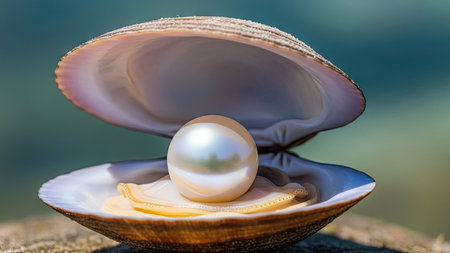 Beautiful seashell holds lustrous pearl, showcasing intricate textures and natural colors. delicate sheen of pearl contrasts with rough surface of shell, creating captivating visual