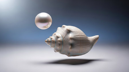 An artistic composition features a hovering pearl and a conch shell set against a gradient background. The image displays a soft, diffused lighting, emphasizing the textures and forms. The visual style suggests a sense of elegance and serenity. Suitable for diverse design projects and editorial content.