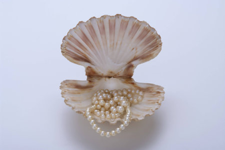 A beautiful pearl nestled in the gleaming nacre of an oyster shell, shot against a plain white background, symbolizing purity and opulence.