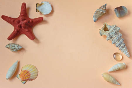 Pastel beige background with copy space and sea shells and starfish. High quality photo