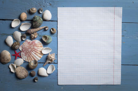Empty white note paper and shells on wood, Holiday concept