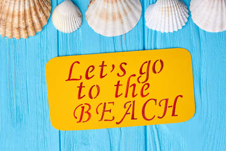 Sea shore from seashells and the inscription sea, summer day, close up