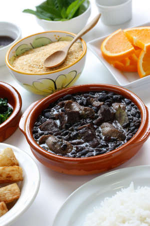 Feijoada, typical Brazilian dish with pork and black beans. Accompanying white rice, farofa, cabbage and orange.