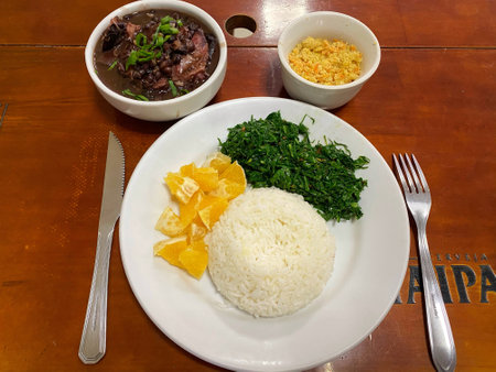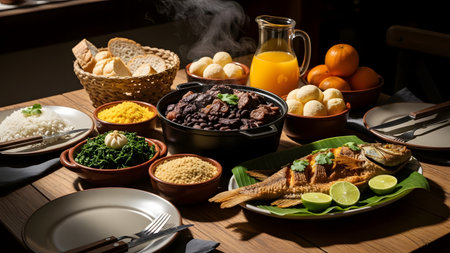 Brazilian table full: feijoada, rice, kale, oranges and farofa., generative AI