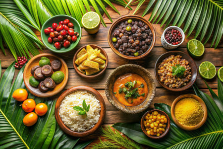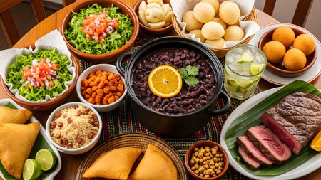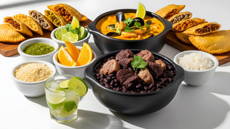 A plentiful feast of Latin American cuisine featuring bowls of feijoada, seafood stew, and empanadas. Accompanied by rice, farofa, sauces, and a caipirinha, the spread represents a rich culinary tradition.