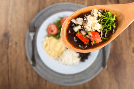 Bean stew. Traditional Brazilian food. ladle with feijoada highlighted and blurred background.