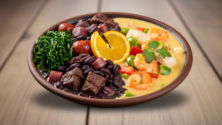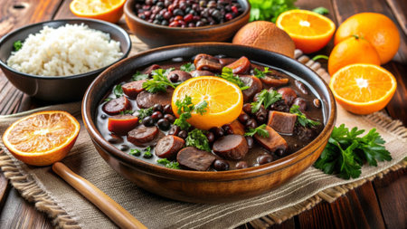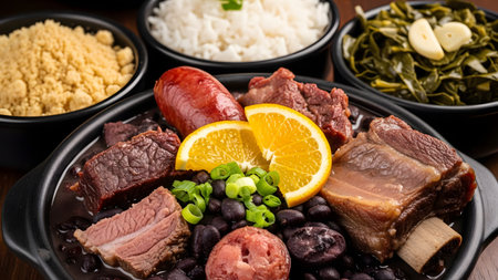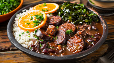 A large features bowl traditional feijoada with black beans, pork, sauteed greens, and orange slices, highlighting Brazilian culinary culture.