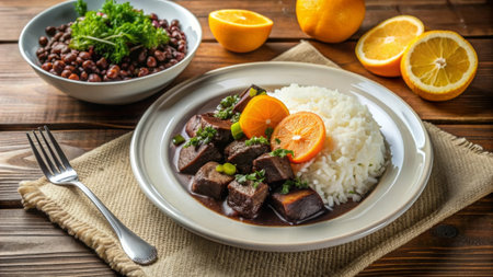 A spread of traditional Brazilian food featuring Feijoada, a black bean and meat stew, served with rice, oranges, and side dishes. The arrangement highlights the rich colors and hearty nature of South American cuisine.