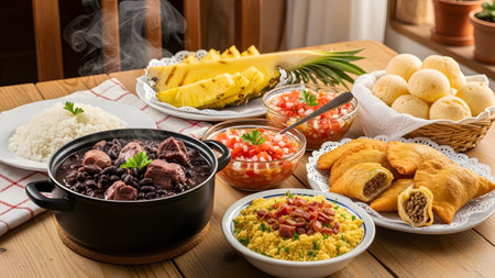 A hearty spread of traditional Brazilian cuisine featuring a pot of Feijoada, rice, pastels, cheese bread, and pineapple slices. The delicious meal is arranged on a wooden table, ready for a family feast.