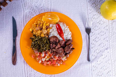 White dish with ingredients of feijoada, typical food of Brazil