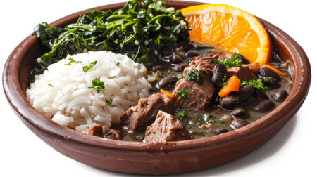 A vibrant bowl of feijoada with rice, orange slice, and collard greens. This delicious brazilian stew is a healthy and flavorful meal.