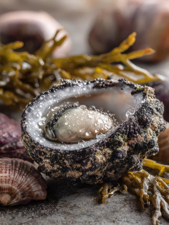 Fresh oysters in a shell with seaweed on a stone background