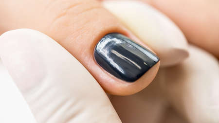Close-up of beautician applying colorful varnish. Applying nail polish on nails with a brush for applying nail polish on fingers. Manicure nail applicator in a beauty salon. In a beauty salon varnish.