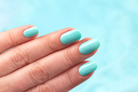 Female hand with beautiful manicure - turquoise, mint blue nails on blue blurred background. Nail care concept