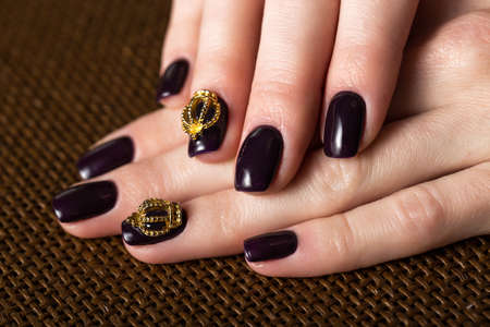 Female hand with long nails and dark purple manicure holds a bottle of nail polish
