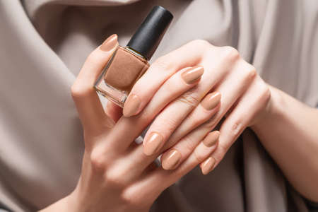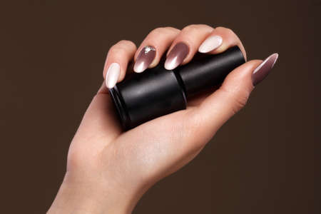 Female hand with beige nail design. Brown nail polish manicure. Woman hand hold beige nail polish bottle