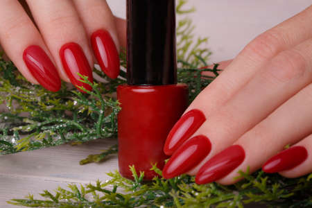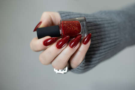 Female hand with long nails and a bright red manicure holds a bottle of nail polish