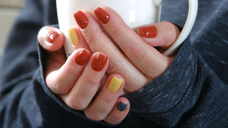 The girl warms up, holding a cup of coffee in her hands. Well-groomed hands beautiful manicure, design for any purpose. Blurred background.