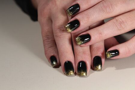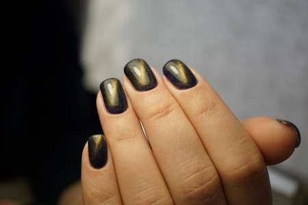 Beautiful female hands with beautiful black manicure nails, beautiful black with shine on a gray striped background textile.