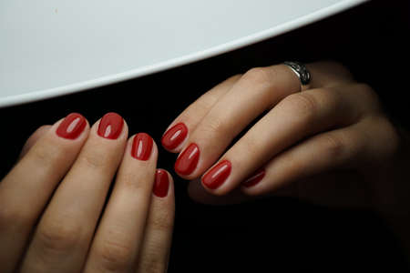 Spoiled cracked red nail polish on hands against the background of a gel polish dryer.