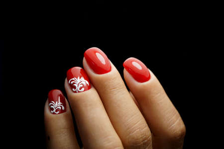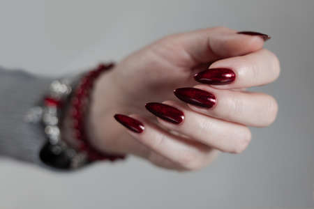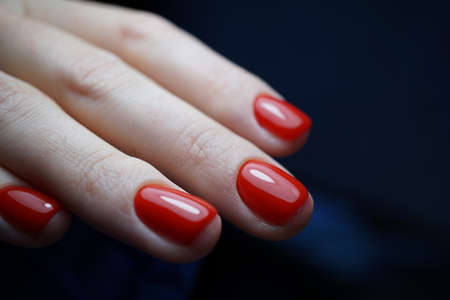 Stylish red female nails. Modern Beautiful manicure. Autumn winter nail design concept of beauty treatment. Gel nails. Skin care. Wellness. Trendy colors.