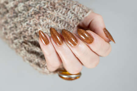 Female hand with long nails and a bottle of golden bronze brown nail polish