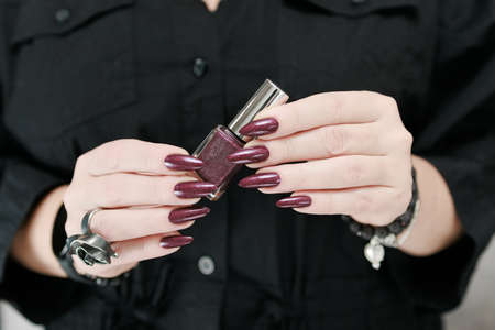 Woman's hands with long nails and a bottle of dark red bordo nail polish
