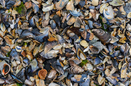 many sea shells of oysters lie on the shore. Background, close-up