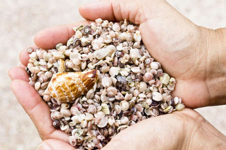 Cupped hands present a treasure trove of various seashells. Hands cradle the oceans secrets, a shell at a time.