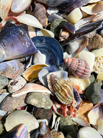 A vibrant assortment of shells and pebbles showcases nature's beauty on a serene beach surface. The colorful textures create an inviting coastal scene.
