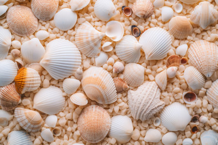 A captivating close-up of numerous seashells, showing their unique textures and colors. A tranquil summer beach scene.