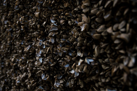 abstract photo of a cluster of mollusk shells on the shore closeup