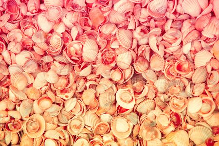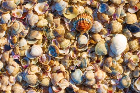 Natural abstract colorful seashells texture background. Selective focus